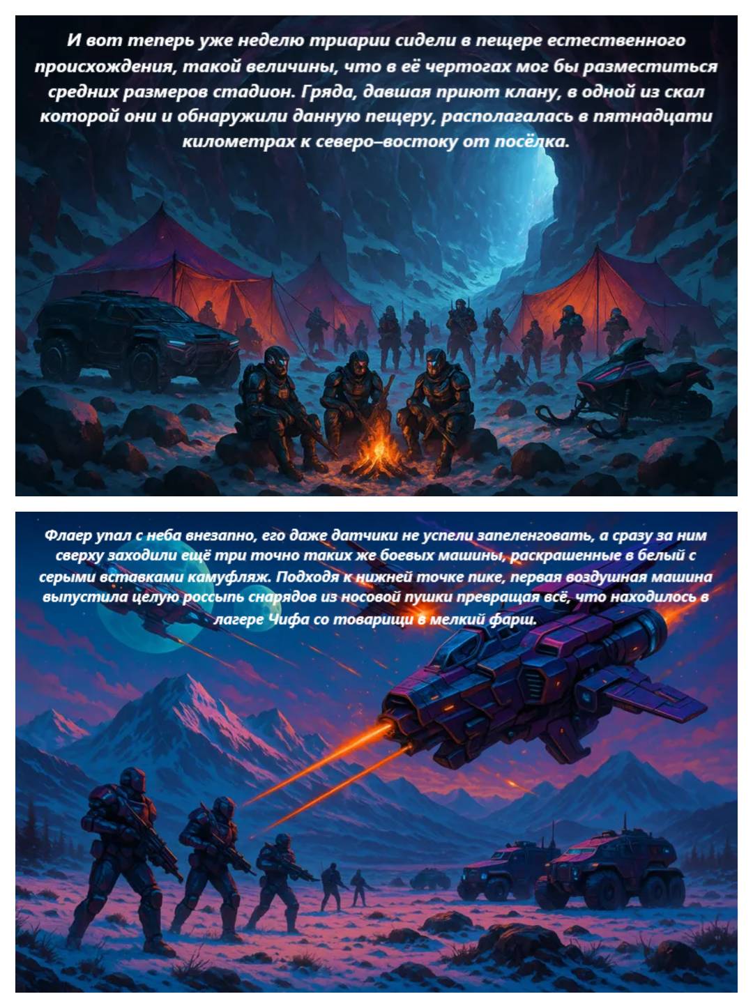 И вот теперь уже неделю триарии сидели в пещере естественного происхождения, такой величины, что в её чертогах мог бы разместиться средней величины стадион. Гряда, давшая приют клану, в одной из скал которой они и обнаружили данную пещеру, располагалась в пятнадцати километрах к северо–востоку от посёлка. Саму пещеру они обнаружили случайно, пытаясь расстрелять из пушки, установленной на флаере, огромного хищника, напомнившего землянам белого медведя, только обладающего, в отличие от его земного аналога, длинным и пушистым хвостом, который попытался напасть на их колонну.