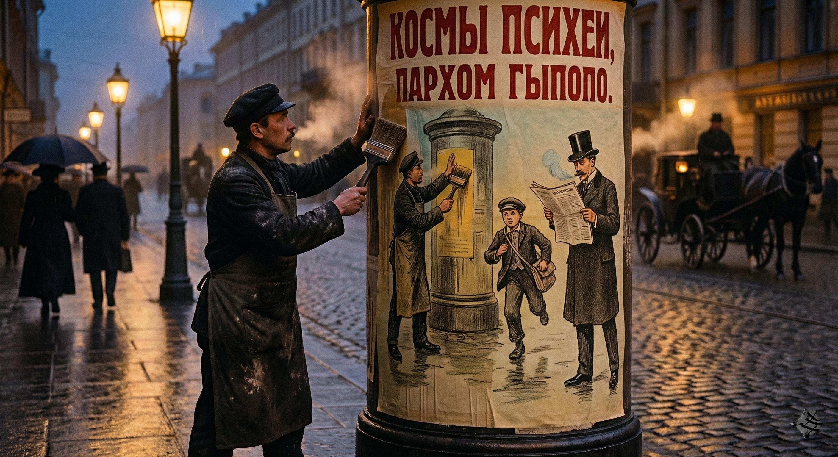 На бегу он едва не врезается в чугунную афишную тумбу. В нос ударяет запах кислого, горячего клейстера. Угрюмый расклейщик только что разгладил ладонью огромный, ещё парящий на морозе свежий лист. Мальчишка бросает взгляд на мокрую краску — и спотыкается...