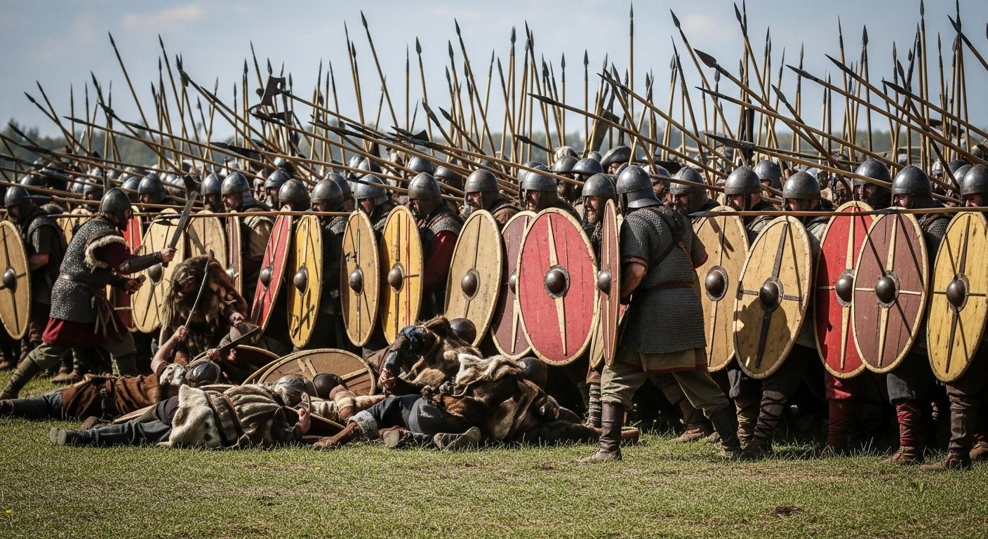 Тогда с очередным исступлённым рёвом гепиды, вооружённые топорами и мечами, густой толпой хлынули из-за деревьев в яростную атаку. К тому моменту уже семь сотен копейщиков стояли несокрушимой фалангой.