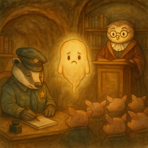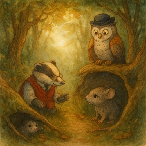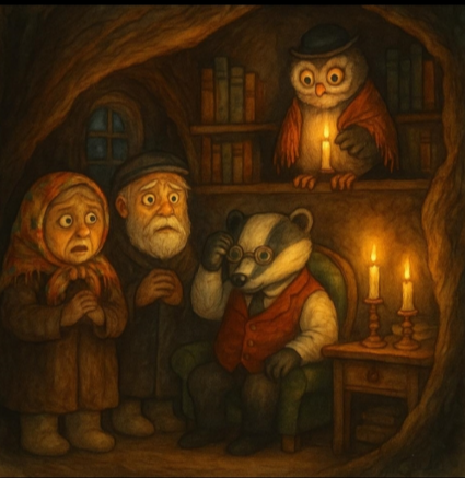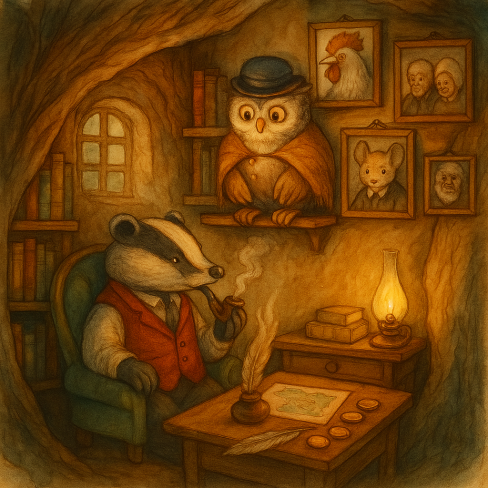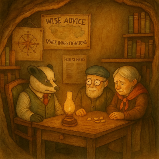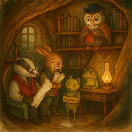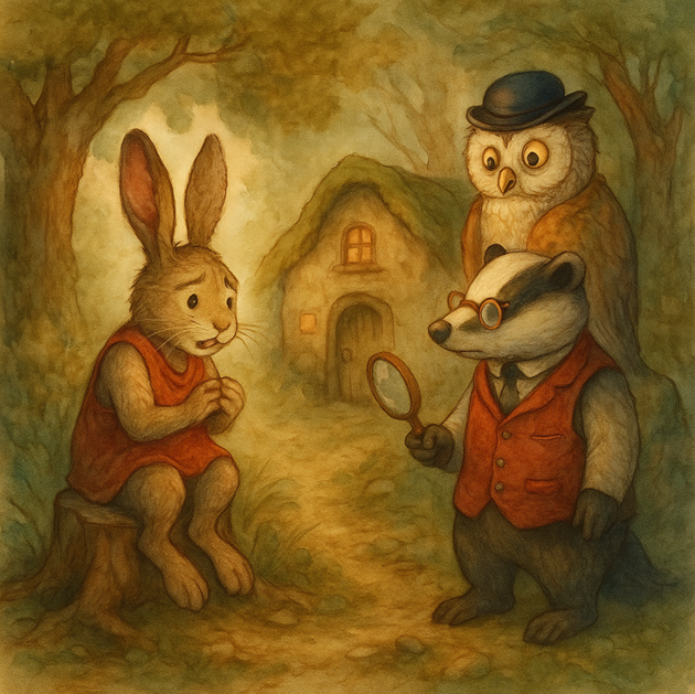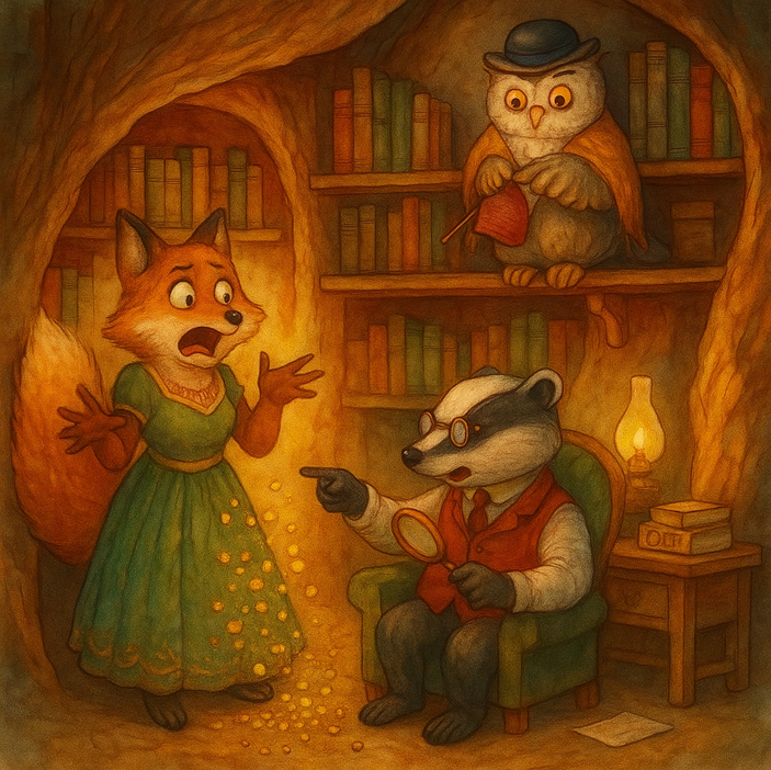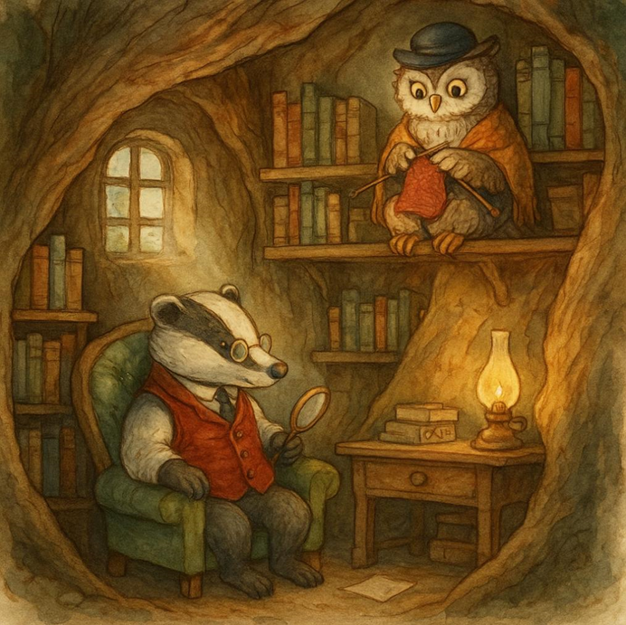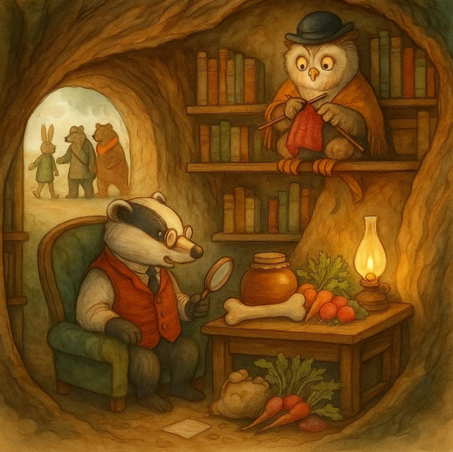Сова и Барсук снова сидели в своей норе, довольные. —Знаешь, — сказал Барсук, — возможно, мы должны работать не только над делами о пропаже, но и быть... этаким арбитром справедливости для маленьких жителей леса.