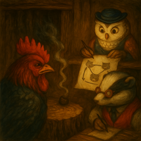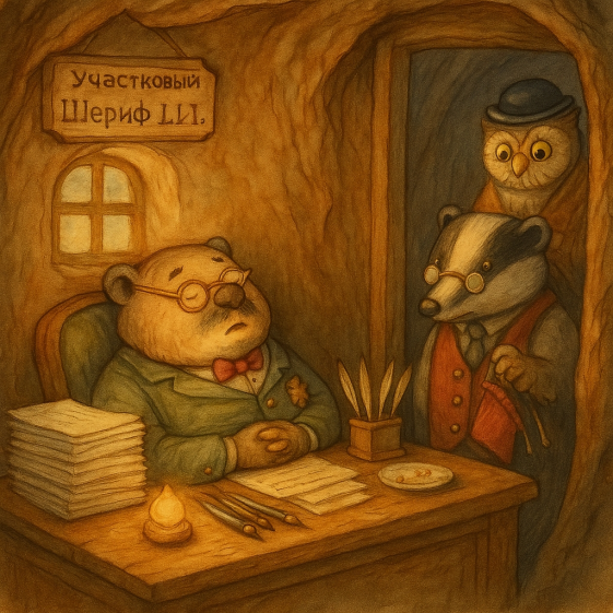 — Коллега, — прервал молчание Барсук, откладывая трубку. — Мы всё думаем о Лисьей шайке. Но есть одна деталь, которая меня беспокоит. Петя Петушок - он честный, хоть и вспыльчивый. Он пошёл бы на всё, чтобы защитить свою невесту. Но его невеста сейчас — та самая преступница, Сорока-воровка, а вот где же настоящая Курочка Ряба?