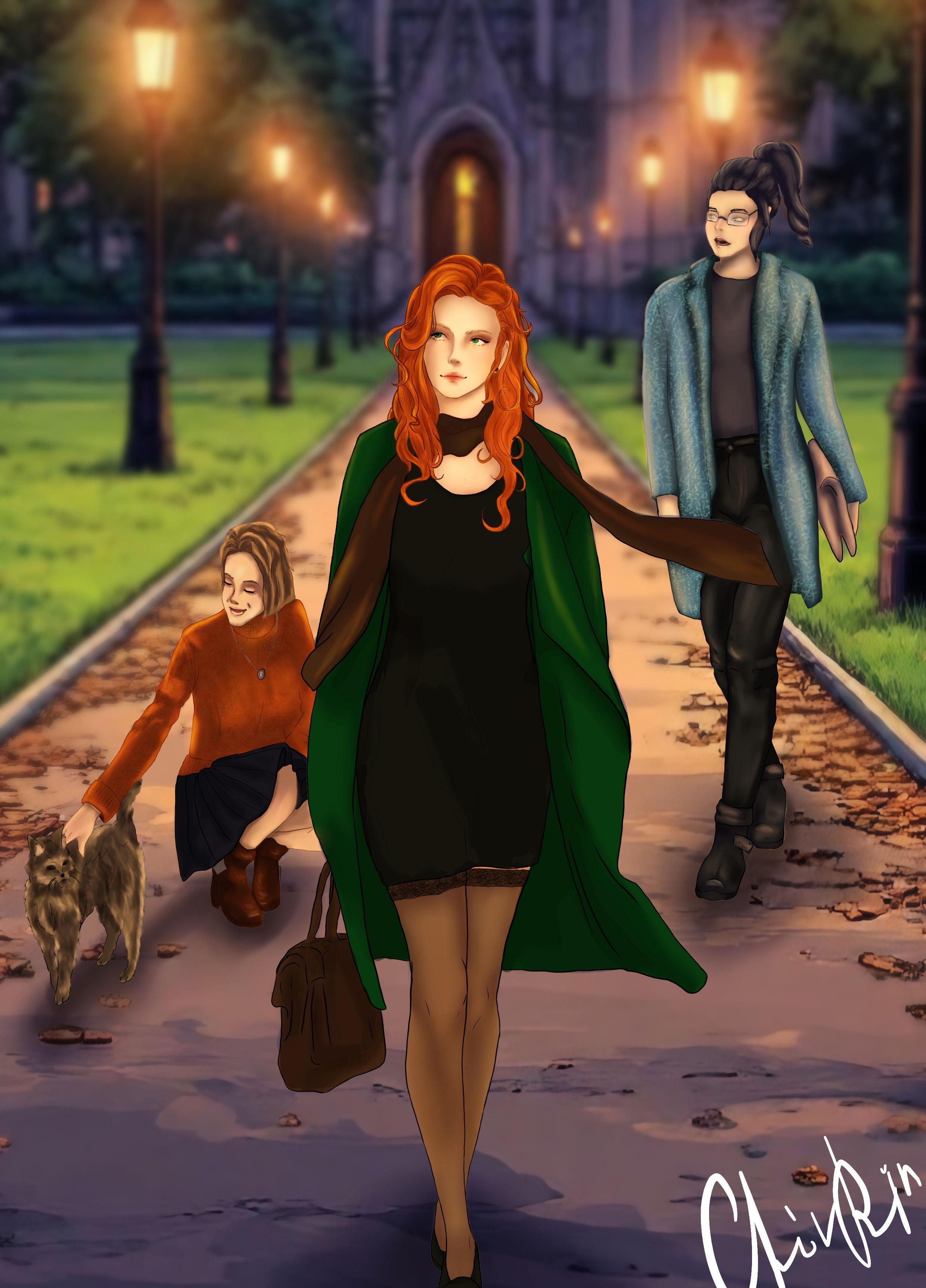 Мойра шагала впереди, её движения были плавными и безмятежными. Медные волосы, вспыхивающие в последних лучах солнца, струились по плечам, оттеняя фарфоровую бледность кожи. Высокие скулы, мягко очерченные губы, тронутые загадочным полунамёком на улыбку, и глаза — глубокие, зелёные, как лесные озёра в сумерках. Она несла себя с той непринуждённой уверенностью, что заставляла оборачиваться вслед даже самых занятых прохожих. Полы её изумрудного пальто вздымались, обнажая стройные ноги в чёрных чулках и лакированных лодочках.