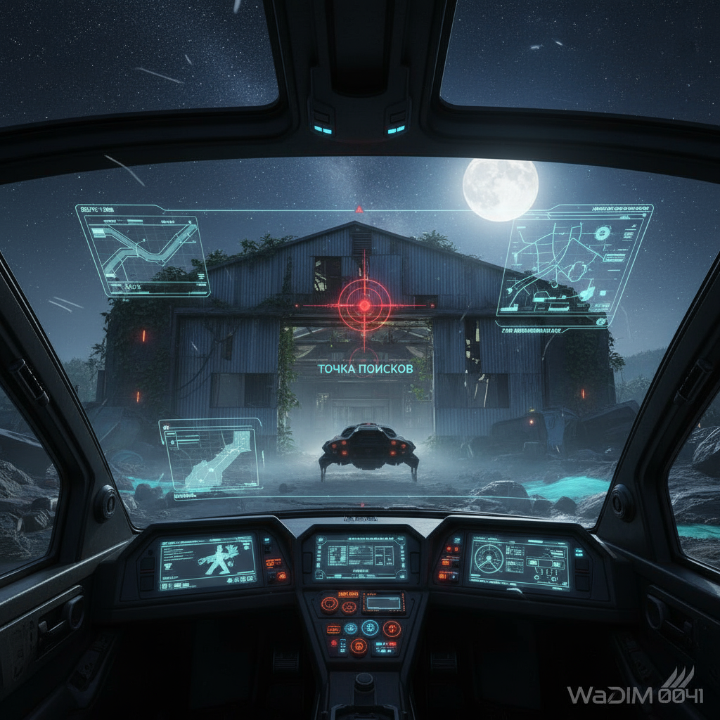 Вадим за штурвалом, его лицо в бледном свете голографической карты — маска сосредоточенности. Рядом Джуна, сжимает камеру, её глаза гоят от предвкушения: "Это будет кадр, который перепишет историю..." Кристиан сверяет данные дронов на планшете, бормоча: "Сигналы совпадают на 98%... Ангар реален*." А Лиана, синтетический интеллект в облике идеальной женщины, стоит у иллюминатора — её позитронные глаза сканируют горизонт: "Вероятность аномалии: 87%. Рекомендую осторожность."