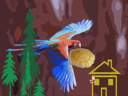 Ара нырнул в кусты, подхватил в клюв золотую монету и быстренько вернулся в дом.