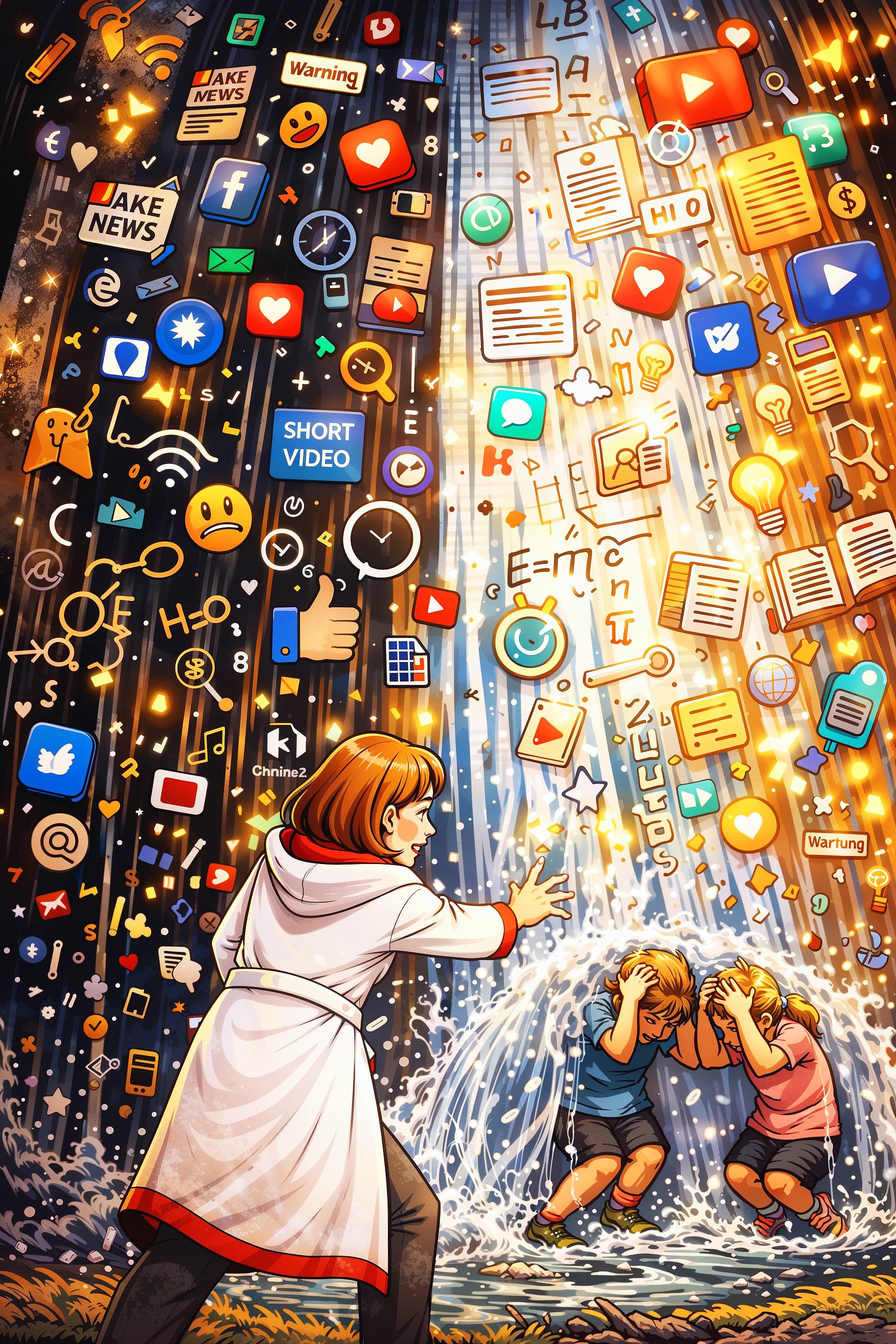Она увидела перед собой бурный водопад из кричащей обо всём на свете информации, знаний, текстов, знаков, формул, игр, соцсетей, математических расчётов, множества коротких видео. Лились в этом водопаде чёрные струи обмана, белые потоки, крадущие жизненное время, пустой информации, а золотыми полосами выделялись необходимые для человека опыт и познания. И под льющимися струями, пригнувшись от их напора, стояли её дети. У Энн так защемило сердце, что она забыла про сон и ринулась к детям, стала кричать, звать их по именам. Дети ничего не слышали и не видели, так чёрная информация застилала им глаза, а белая пена попадала в уши. Она поняла, что она должна быть там, с ними в этом потоке. Волшебным образом Энн оказалась рядом с детьми, крепко взяла их за руки и показала направление к золотистым струям. Дети поняли намерения матери и уже мастерски стали лавировать между мутными водами, беря всю ответственность безопасного прохода. Под сверкающими струями Энн и дети выпрямились во весь рост. Позже, когда они обсохли, лёжа на прогретом от солнца песке, дети вместе с Энн обсудили ситуацию, сделали выводы на будущее. Энн, глядя на детей, ясно осознала свою значимость родителя как наставника, ответственного за безопасность, здоровье и базовые ценности. Она увидела и почувствовала, что детям также необходима поддержка, возможность довериться и надёжный тыл.