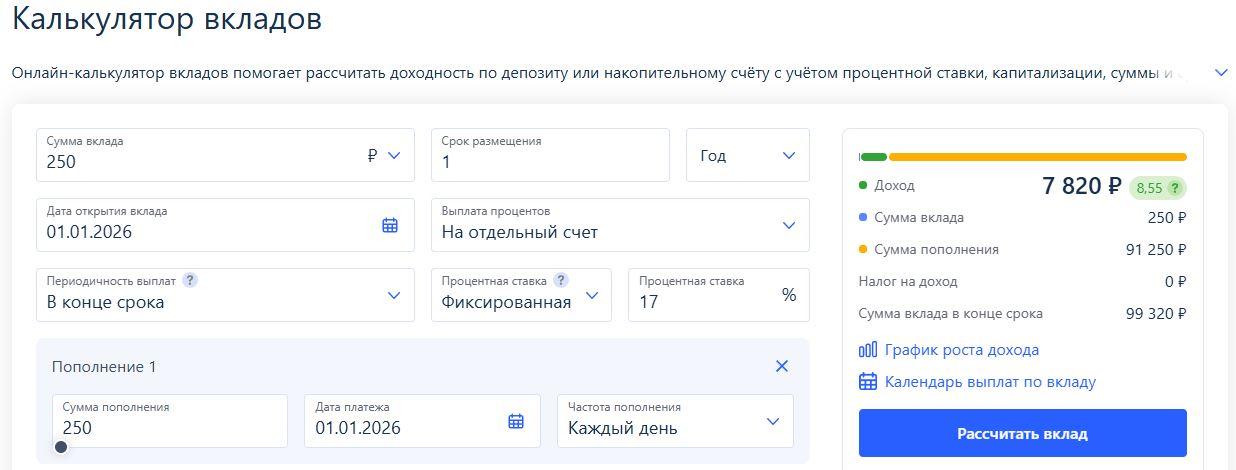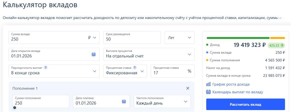 Если каждый день пополнять банковский счет по 250 рублей, то через 50 лет у тебя будет около 20000000 рублей на счете.