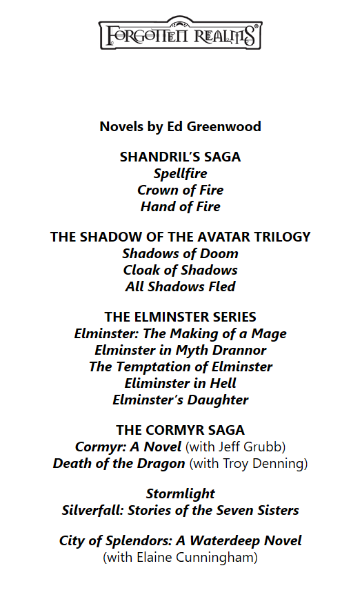 Приветствуем и благодарим мастеров фольклора, которые полюбили Кормир, и за их работу над ним, в том числе Эрика Бойда, Гранта Кристи, Тома Косту, Джорджа Крашоса и Брайона Вишштадта — и, конечно же, Троя Деннинга, Джеффа Грабба, Эрика Хаддока и Стивена Шенда.
