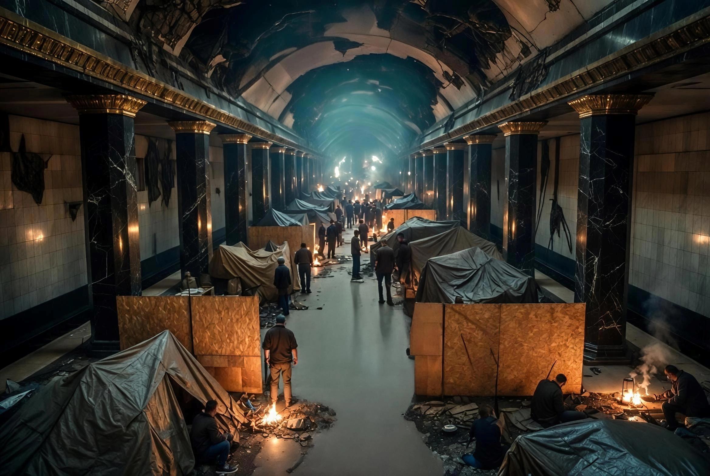 Это была «Партизанская». Он узнал колонны, узнал платформы. Но всё остальное… Вдоль стен, где раньше висели рекламные щиты, теперь стояли палатки из брезента и самодельные перегородки из фанеры и металла. Горели небольшие костерки, дым уходил в вентиляционные шахты. Пахло едой, керосином и людьми. Много людей. Они сидели, ходили, разговаривали, чинили одежду, готовили еду. Где-то плакал ребенок.