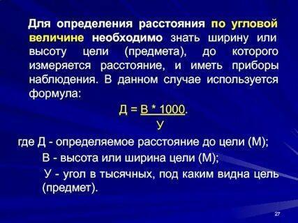 А формулу дальности попробовал вывести умозрительно: "...если в дроби угловой размер и поперечник предмета, то что должно быть в числителе? Зафиксируем угол, поиграем с поперечником, чем он меньше, тем ближе предмет, меньше дистанция, а чем больше, тем с большего расстояния под таким угловым размером виден. Зависимость прямая. Значит, метры в дроби сверху, в числителе. А теперь закрепим поперечник, поиграем углом. Предмет одного размера, чем большего угла он требует, тем меньше до него расстояние. Зависимость обратная. Значит, угол в дроби знаменателем, снизу.