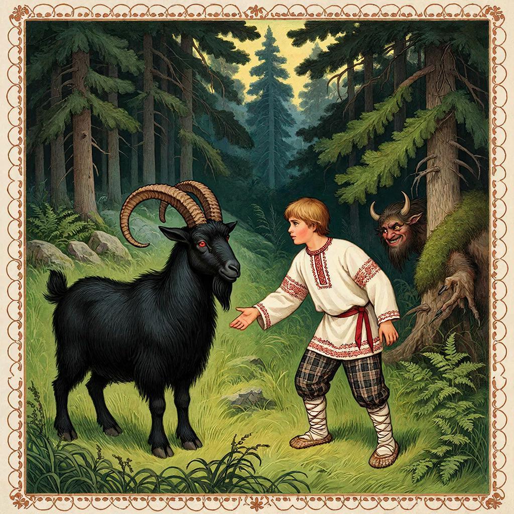 Идёт он лугами, к лесу подбирается – глядь, на Козлином лужку козёл пасётся. Стада никакого поблизости не видать, пастух нынче к старице скотину повёл. Поглядел Лёнька вкруг - никого. «Козлик-то, кажись, ничейный, - смекнул паренёк. - Чего добру пропадать?» Решил он козла к рукам прибрать. Подошёл поближе, за рога ухватил и за собой повёл.