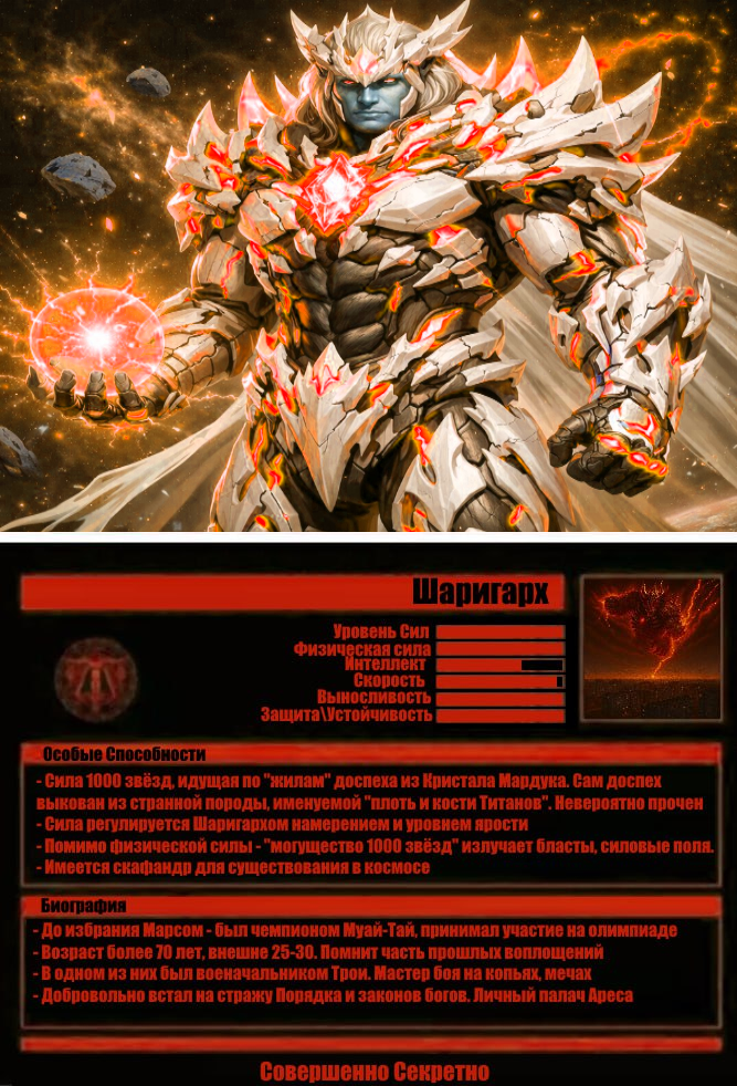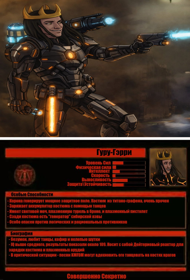 Из-за покрышек вылетает **Гуру-Гэрри**. Буквально вылетает — спотыкается о какую-то железяку, кувыркается через голову, но встаёт на ноги с грацией пьяного фламинго. Экзоскелет из титано-графенового сплава сияет в свете фонарей — чистый, надраенный, будто он только что с выставки. Корона на голове генерирует силовое поле, которое переливается всеми цветами радуги, аналогично не подавая никаких отсылок. За спиной тихо гудит дейтериевый реактор. На поясе — световой меч и плазменный пистолет. За спиной — сложенная плазменная турель, установленная в плече экзоскелета. Такая мощь, но у такого... дебила. Что тут скажешь - Тони Старк в Кали-Юге, родившийся в ебаной России.
