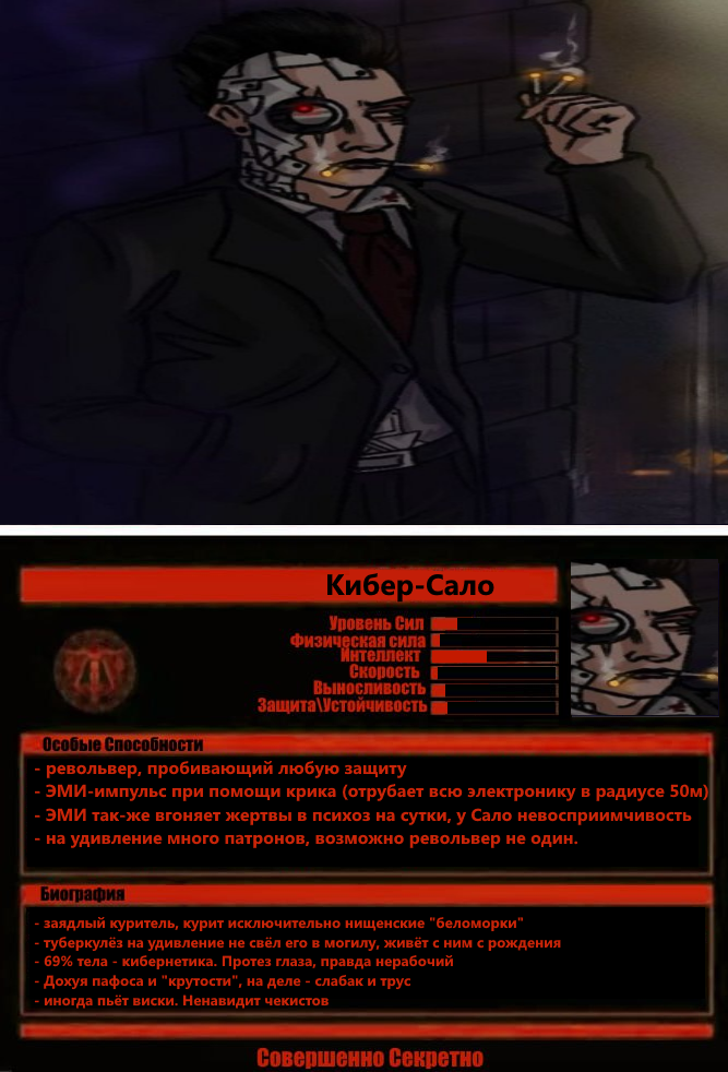 **Кибер-Сало** стоит у ржавого контейнера, прислонившись к нему плечом. Чёрное кожаное пальто, галстук, чёрный эрокез, собранный в хвост. Металлические пластины на голове тускло блестят в свете редких фонарей. Правый глаз — кибернетический имплант, который он себе вживил чисто по приколу. Не видит им нихуя, но выглядит внушительно. Изо рта торчит сигарета "беломорка-69". Он затягивается, и тут же его грудь разрывает кашель — сухой, надрывный, с металлическим призвуком.