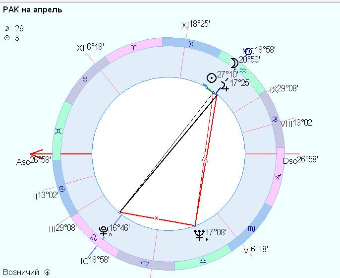 Продолжаем делать прогноз для женщины Рака. И я сказал, что на апрель любовь отменяется. А почему я так сказал? А сейчас увидите. Выставляем планеты на карту.