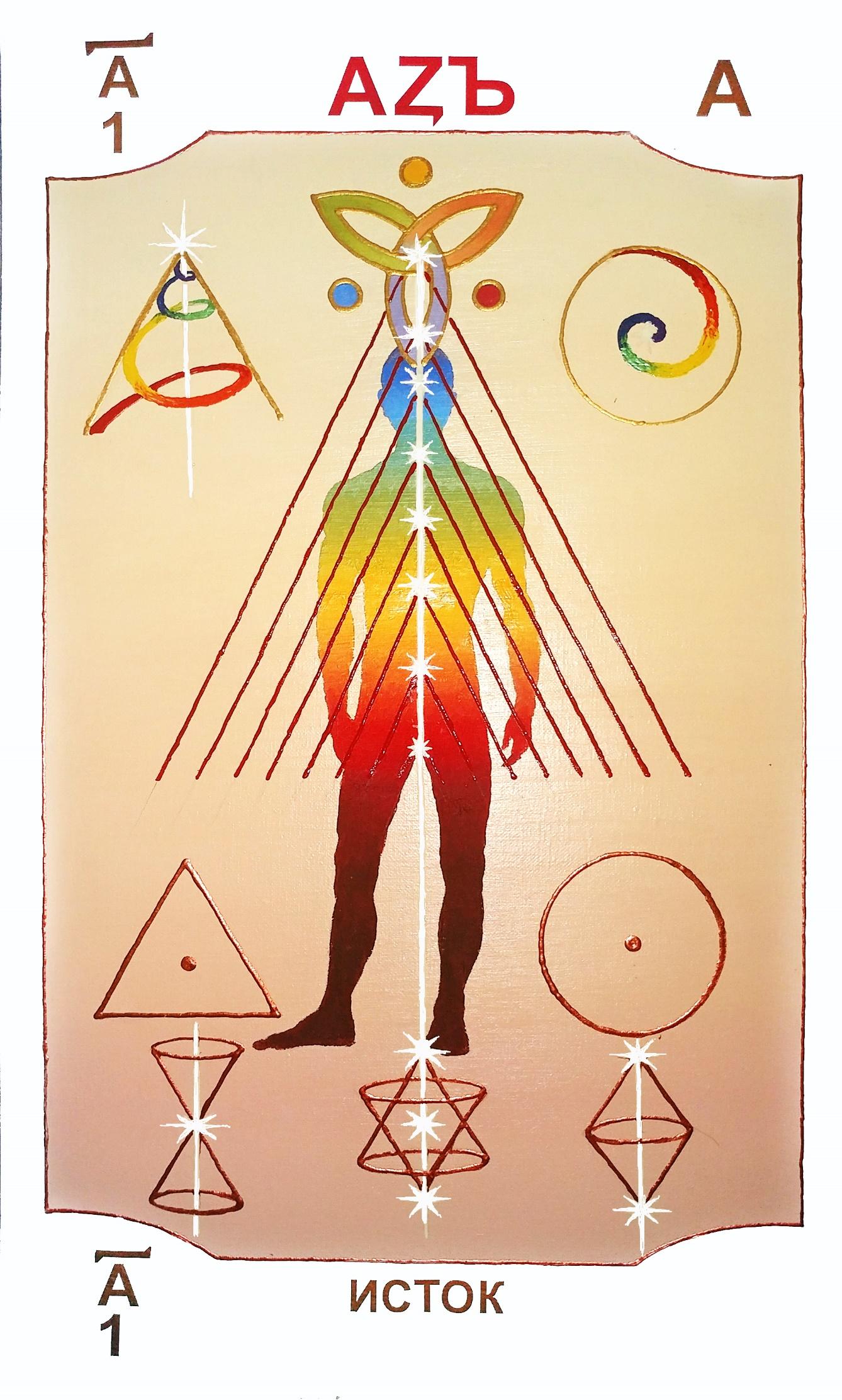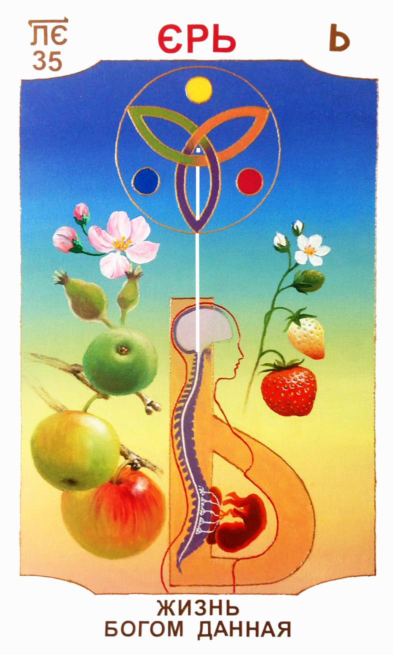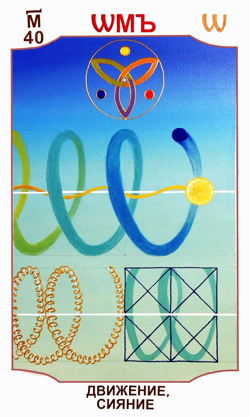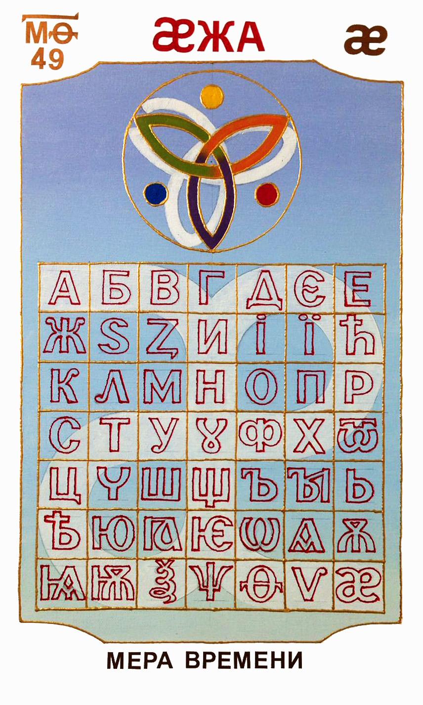 » указывает на меру времени пути совершенствования тела и Души и включает в себя все остальные буквицы, последовательность которых указывает на основы мироустройства, и на образные «ключи», которые необходимы для более глубокого проникновения с-о-знания в тайны Вселенной.