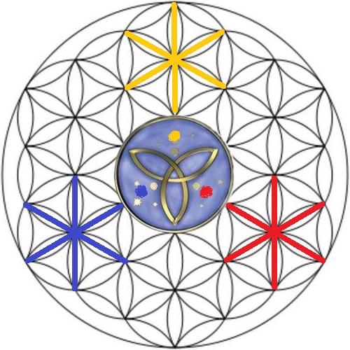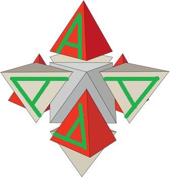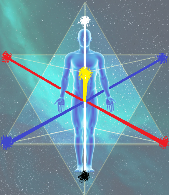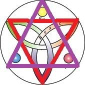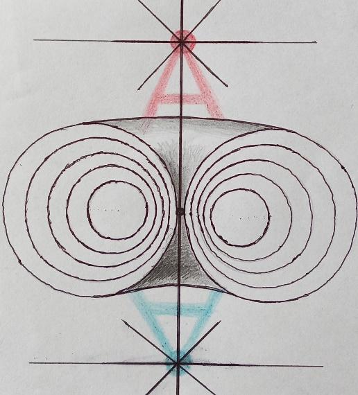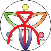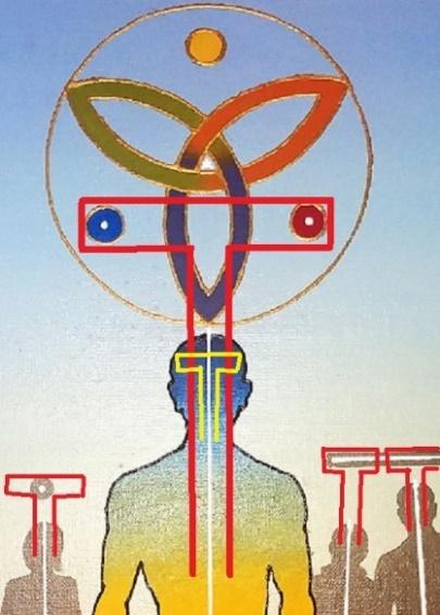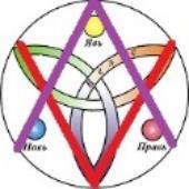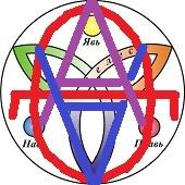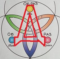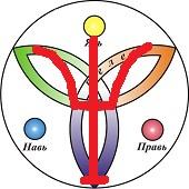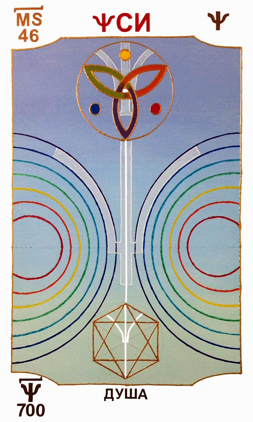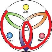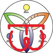 На схематическом плоском рисунке это единение Духа и Души будет выглядеть подобно встрече двух противоположных истоков Духа (фиолетовая «А» и синяя «А») в центре и создание с помощью резонанса (Т) общей оной структуры (