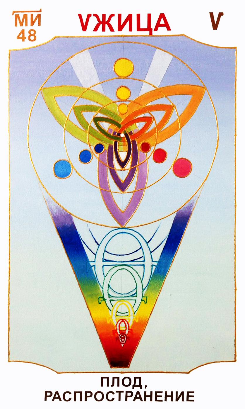 ). Это наша внутренняя вселенная, которую мы учимся творить с помощью единства Духа. Так мы совершенствуемся и так совершенствуются все. Так маленькие формы жизни увеличивают свои оные структуры, которые переходят на более высокие уровни развития и воплощаются в более совершенных телах. Это путь увеличения знаний и опыта, путь совершенствования и расширения снизу вверх по увеличивающейся спирали. Потому, следующая буквица - «Vжица» - гармоничное распространение, рост; увеличение.